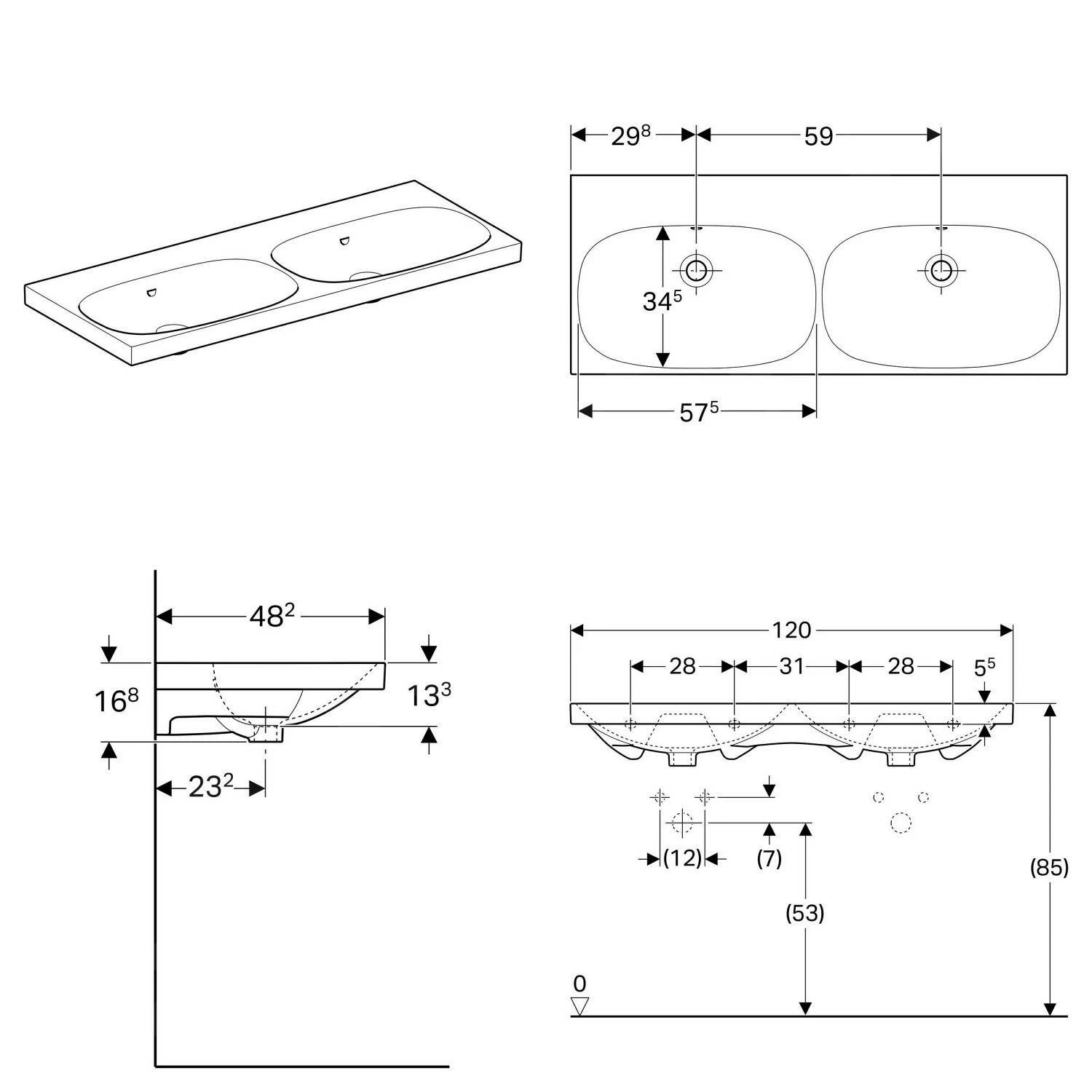 Doppelwaschtisch mit Überlauf, ohne Hahnloch