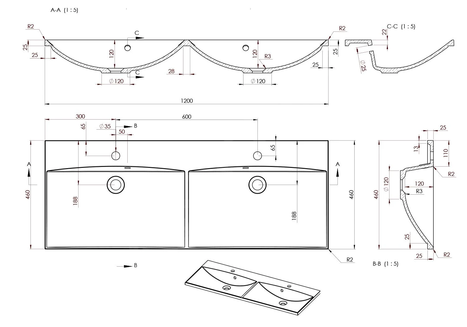 Waschtisch für den Einbau in Möbel mit 2 Überläufen