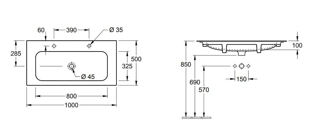 Einbaudoppelwaschtisch ohne Überlauf mit CeramicPlus, 2 Hahnlöcher